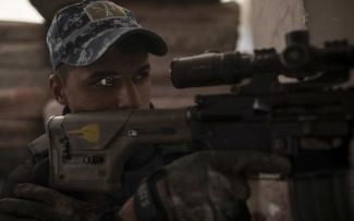«Το ISIS είναι εκεί έξω», λέει ο νεαρός απομακρύνοντας το βλέμμα του από το στόχο για μια στιγμή. «Μόλις πίσω από αυτά τα κτίρια», προσθέτει και συνεχίζει: «Πριν από 2-3 μέρες, έφτιαξαν ένα παραπέτασμα καπνού και αργότερα βγήκαν μερικοί με γιλέκα αυτοκτονίας... Σκότωσα δυο από αυτούς».
