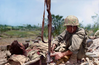 Η φωτογραφία αυτή τραβήχτηκε στην Οκινάουα το 1945. Πρόκειται για τη πιο φονική μάχη που έδωσε ο αμερικανικός στρατός στο μέτωπο του Ειρηνικού. Αλλά και την τελευταία χερσαία επιχείρηση του αμερικανικού στρατού στο Β παγκόσμιο πόλεμο.