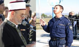 Τον όρκο ανέγνωσε ο τοποτηρητής της Μουφτείας Κομοτηνής Τζιχάτ Χαλήλ και ο νεαρός δόκιμος αστυφύλακας επανέλαβε.