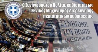 Ο ΣΥΝΗΓΟΡΟΣ ΤΟΥ ΠΟΛΙΤΗ, ΚΑΘΙΣΤΑΤΑΙ ΩΣ ΕΘΝΙΚΟΣ ΜΗΧΑΝΙΣΜΟΣ ΔΙΕΡΕΥΝΗΣΗΣ ΠΕΡΙΣΤΑΤΙΚΩΝ ΑΥΘΑΙΡΕΣΙΑΣ