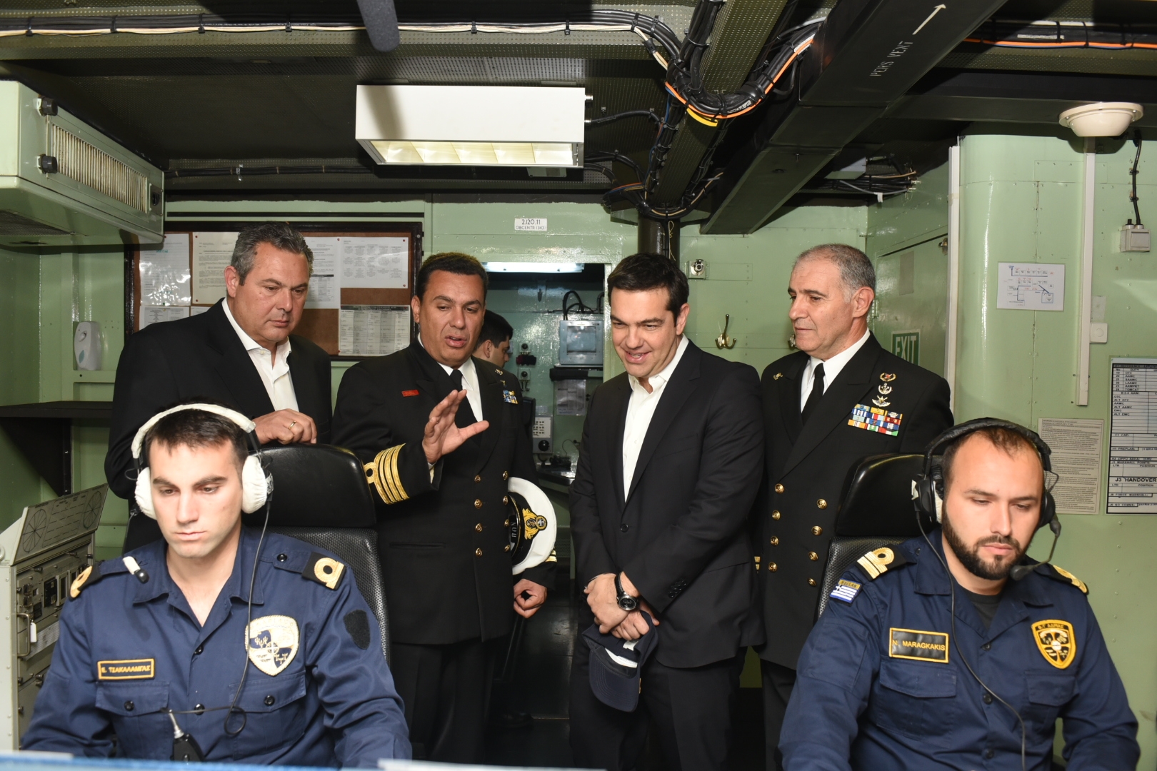 Ο Αλέξης Τσίπρας βρέθηκε στη φρεγάτα, συνοδευόμενος από τον υπουργό Εθνικής Αμυνας, Πάνο Καμμένο, όπου ενημερώθηκε από τους αξιωματικούς και αντάλλαξε ευχές μαζί τους και με το πλήρωμα, ενώ υπήρξε και το παραδοσιακό τσούγκρισμα αβγών της ημέρας.