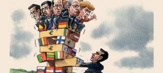 Στο σκίτσο του Ινγραμ Πιν ο Αλέξης Τσίπρας αφαιρεί το «τουβλάκι» της Ελλάδας από τον «πύργο» της ευρωζώνης, στην κορυφή του οποίου κάθονται η Ανγκελα Μέρκελ, ο Φρανσουά Ολάντ, ο Βόλφγκανγκ Σόιμπλε, ο Μαριάνο Ραχόι και άλλοι ηγέτες.