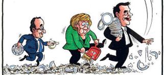 Ποια είναι αυτή; Κι όμως, ο Έλληνας πρωθυπουργός απεικονίζεται να σπάει πιάτα και να τον ακολουθούν η Άνγκελα Μέρκελ και ο Φρανσουά Ολάντ. Η πρώτη μαζεύει τα σπασμένα και ο δεύτερος τα κολλάει!