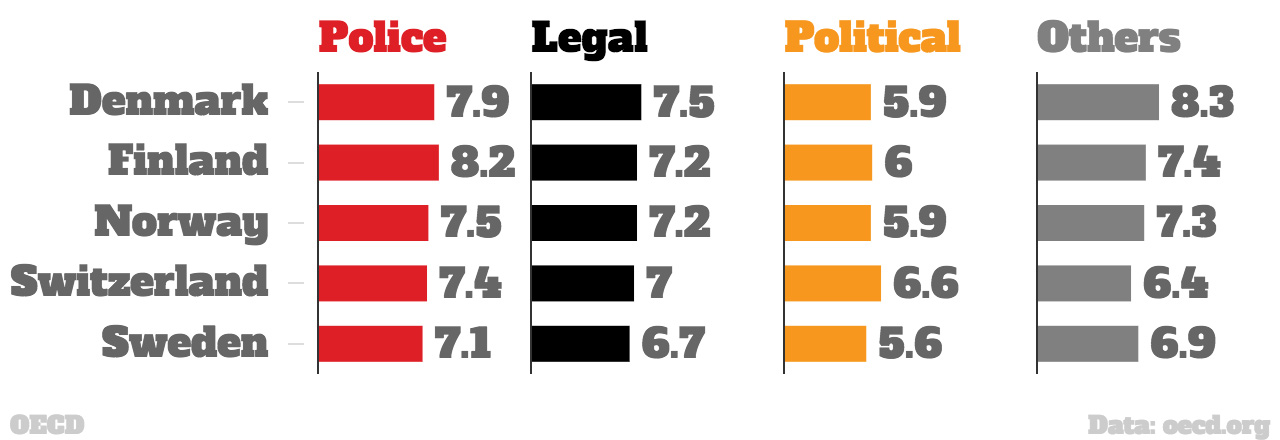 Ο OECD πραγματοποίησε έρευνα και δημιούργησε λίστα με τις ευρωπαϊκές χώρες, που έχουν και δεν έχουν εμπιστοσύνη στα παραπάνω.