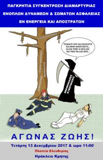 Την Τετάρτη 13 Δεκεμβρίου 2017 και ώρα 11:00΄ στη Πλατεία Ελευθερίας στο Ηράκλειο πραγματοποιούμε Παγκρήτια Συγκέντρωση Διαμαρτυρίας Ενστόλων Σωμάτων Ασφαλείας & Ενόπλων Δυνάμεων προκειμένου να εκφράσουμε την αγανάκτησή μας στη συνεχή αφαίμαξη μισθών και συντάξεων που πλήττουν κατάφορα εμάς και τις οικογένειές μας.
