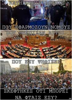 Να αναφέρω ένα παράδειγμα, αν η βουλή νομοθετήσει άρση τον πλειστηριασμων και δίωξη όλων των πολιτών που έχουν κόκκινα δάνεια, θα φταίει ο απλός αστυνομικός που δέχεται εντολή να εφαρμόσει τον νόμο του πολιτικού;