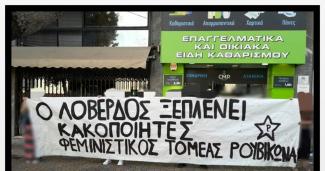 Εμείς θα συνεχίσουμε να μαχόμαστε και στα δύο πεδία: θα συνεχίσουμε να πολεμάμε και τους ανθρώπους-πλυντήρια και τους κακοποιητές. Για το λόγο αυτό, σήμερα Σάββατο 12 Ιουνίου επισκεφτήκαμε το πολιτικό γραφείο του Γιάννη Λοβέρδου και πραγματοποιήσαμε παρέμβαση στην είσοδο, για να αποκαταστήσουμε στο δημόσιο λόγο αυτό που πρέπει να λέγεται έως ότου γίνει κτήμα της κοινωνίας: