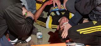 Στην προσπάθειά του ο τελευταίος χτύπησε δυνατά το κεφάλι του σε σίδερο που βρισκόταν εκεί, με αποτέλεσμα να τραυματιστεί, πέφτοντας αιμόφυρτος στο γήπεδο. Αμέσως, διακομίσθηκε σε κοντινό νοσοκομείο όπου του παρασχέθηκαν οι πρώτες βοήθειες και έγιναν ράμματα.