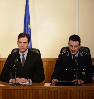 Καταβάλλουμε κάθε δυνατή προσπάθεια για την καταπολέμηση της εγκληματικότητας. Για μία Αστυνομία δίπλα στον πολίτη. Κ. Ταξίαρχε έχετε το λόγο.». Διοικητής Διεύθυνσης Ασφάλειας Αττικής, Ταξίαρχος Παναγιώτης Στάθης : «Καλό μεσημέρι. Ο κύριος Εκπρόσωπος στην εισήγησή του τόνισε ακριβώς την υλοποίηση των εντολών της Πολιτικής και της Φυσικής Ηγεσίας για τη διαλειτουργικότητα, την επιστημοσύνη και την μεθοδολογία στην έρευνα, με σύγχρονα μεθοδολογικά και επιστημονικά εργαλεία. Αυτή η σπουδή στη γνώση έχει αποτέλεσμα όταν οι Υπηρεσίες μας διασυνδέονται επιχειρησιακά, πληροφοριακά και ανακριτικά. Οι επιχειρησιακές μονάδες έρχονται να υλοποιήσουν το έργο της ανάλυσης και πολύ περισσότερο να αποδείξουν ότι η συνεργατικότητα είναι εμφανής, παρούσα και αποτελεσματική. Για τη συγκεκριμένη περίπτωση, συνελήφθησαν στην Πάτρα από αστυνομικούς της Διεύθυνσης Ασφάλειας Αττικής, δύο αλλοδαποί υπήκοοι, ο ένας με τουλάχιστον 11 ψευδώνυμα ομόηχα ή ομόρριζα, ετών 32 ή 33 ή 35, καθώς και ένας ομοεθνής του, 27χρονος. Καταρχήν κατηγορούνται για παράβαση του Νόμου 2168/93 «Περί όπλων». Από την έρευνα της Υπηρεσίας, προέκυψαν τα εξής: Ο πρώτος δράστης ταυτοποιήθηκε προανακριτικά με βάση πραγματολογικά αποδεικτικά δεδομένα και μεθοδολογικά στοιχεία ως υπαίτιος διάπραξης τριών ανθρωποκτονιών. Σε βάρος του εκδόθηκαν εντάλματα σύλληψης για ανθρωποκτονίες με πρόθεση και ληστείες, που τελέστηκαν στην Νάξο, στην Τρίπολη και στην Κυπαρισσία και αναζητείτο από τις Υπηρεσίες μας για να συλληφθεί. Ειδικότερα, σε βάρος του εκκρεμούσαν διωκτικά έγγραφα ως εξής: το υπ’ αριθμ. 6/2011 από 5/12/2011 ένταλμα σύλληψης του Ανακριτή Πρωτοδικείου Κυπαρισσίας, το οποίο επικαιροποιήθηκε στις 20/1/2012 με βούλευμα του Συμβουλίου Πλημμελειοδικών Κυπαρισσίας. Αφορούσε σε εγκλήματα ανθρωποκτονίας από πρόθεση και ληστείας, πράξεις που τελέστηκαν 10 Μαΐου 2011, με θύμα ημεδαπό 79χρονο στο χωριό Σπηλιά του Δήμου Τριφυλλίας Μεσσηνίας. Εκκρεμούσε το υπ’ αριθμ. 2/2012 από 27/1/2012 ένταλμα σύλληψης του Ανακριτή του Πρωτοδικείου Τριπόλεως, που επικαιροποιήθηκε με το βούλευμα του Συμβουλίου Πλημμελειοδικών Τριπόλεως στις 4/7/2013 και αφορούσε έγκλημα ανθρωποκτονίας από πρόθεση με ενδεχόμενο δόλο και ληστείας κατά συναυτουργία, ανθρωποκτονία που τελέστηκε την 4/9/2011 στο Δ.Δ. Βουρβούρων Αρκαδίας σε βάρος 78χρονου ημεδαπού και απόπειρας ανθρωποκτονίας και ληστείας σε βάρος της συζύγου του, 80χρονης ημεδαπής. Εκκρεμούσε ακόμη το υπ’ αριθ. 13/2014 από 1/12/2014 ένταλμα σύλληψης του Ανακριτή του Πρωτοδικείου Νάξου για ανθρωποκτονία από πρόθεση σε βάρος ημεδαπής, 59χρονης, η οποία έχει γεννηθεί στο Βαθύ Σάμου και βρέθηκε δολοφονημένη 18 Οκτωβρίου 2014 στον οικισμό Γαλανάδο Νάξου. Σε βάρος του εκκρεμούσαν ακόμα αποφάσεις του Τριμελούς Πλημμελειοδικείου Λαμίας από το 2006 για τετελεσμένη κλοπή, απόφαση του Τριμελούς Πλημμελειοδικείου Τριπόλεως, από 23/2/2006, ομοίως για κλοπή. Απόφαση Μονομελούς Πλημμελειοδικείου Τριπόλεως για τετελεσμένη κλοπή, 8/4/2013. Από τη Διεύθυνση Εγκληματολογικών Ερευνών, τα αποτυπώματα του δράστη ταυτοποιήθηκαν σε πλήθος κλοπών και διαρρήξεων σε κατοικίες που διαπράχθηκαν σε περιοχές της Αρκίτσας και των Λιβανάτων Φθιώτιδος, καθώς και στην Πάτρα Αχαΐας, κατά το χρονικό διάστημα τουλάχιστον από τον Απρίλιο του έτους 2008 έως και το Φεβρουάριο του έτους 2015. Ενόψει των προαναφερομένων κατά συρροή εγκλημάτω