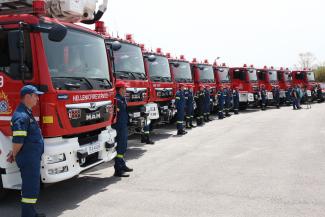 Παρουσία του Υπουργού Προστασίας του Πολίτη Μιχάλη Χρυσοχοΐδη, πραγματοποιήθηκε σήμερα, 20 Μαΐου 2020, στις εγκαταστάσεις της 1ης Ειδικής Μονάδας Αντιμετώπισης Καταστροφών, η τελετή παράδοσης στο Πυροσβεστικό Σώμα τριάντα πέντε (35) πυροσβεστικών οχημάτων, στο πλαίσιο της Προγραμματικής Περιόδου 2014-2020, σύμφωνα με την οποία το Πυροσβεστικό Σώμα εξασφάλισε μεταξύ άλλων τη χρηματοδότηση πράξης από το Περιφερειακό Επιχειρησιακό Πρόγραμμα «Αττική 2014-2020» με τίτλο «Εξοπλισμός Αντιμετώπισης Φυσικών και Ανθρωπογενών Καταστροφών στην Περιφέρεια Αττικής», συνολικού προϋπολογισμού πέντε εκατομμυρίων (5.000.000) ευρώ.