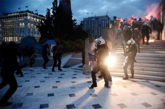 Λίγο αργότερα κουκουλοφόροι επιτέθηκαν στις αστυνομικές δυνάμεις που βρίσκονταν παρατεταγμένες μπροστά από το Μνημείο του Άγνωστου Στρατιώτη επιχείρωντας να ανέβουν τα σκαλιά για να φτάσουν στο προαύλιο χώρο της Βουλής.