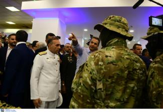 Στο περίπτερο του υπουργείου Εθνικής άμυνας τον πρωθυπουργό υποδέχτηκαν ο αρμόδιος υπουργός Νίκος Παναγιωτόπουλος και η ηγεσία των ενόπλων δυνάμεων.