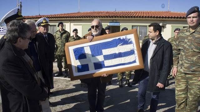 Η φρουρά στο Φαρμακονήσι χάρισε στον Υπουργό Ναυτιλίας και Νησιωτικής Πολιτικής, Παναγιώτη Κουρουμπλή τη σημαία που κυμάτιζε στον ιστό του νησιού, μοναδικοί κάτοικοι του οποίου είναι οι στρατιώτες και το κλιμάκιο των Ειδικών Δυνάμεων του Λιμενικού Σώματος Ελληνικής Ακτοφυλακής, που φρουρούν το ακριτικό νησί.