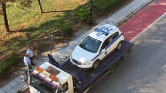 Πάνω στον… ποδηλατόδρομο της οδού Αμαλίας, έμεινε από βλάβη περιπολικό της ΕΛ.ΑΣ., το πρωί της Κυριακής.