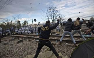 Η μια ομάδα έκλεισε τα σύνορα και ξεκίνησε πετροπόλεμος, με την άλλη ομάδα, αυτή των προσφύγων που τους επιτρέπεται η είσοδος στα Σκόπια.