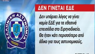 "Δεν υπάρχει λόγος να γίνει καμία ΕΔΕ για τα χθεσινά επεισόδια στο Ειρηνοδικείο. Θα ήταν κάτι περισσότερο από άδικο για τους αστυνομικούς που επί 35 λεπτά δέχονταν γροθιές, κλωτσιές και κάθε είδους αντικείμενο, να βρεθούν υπόλογοι", ανέφερε υψηλόβαθμος αξιωματούχος της ΕΛ.ΑΣ. ερωτώμενος για τα χθεσινά επεισόδια, σύμφωνα με το ρεπορτάζ του ΑΝΤ1.
