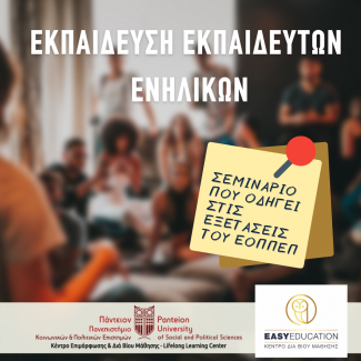 Το Κ.Ε.ΔΙ.ΒΙ.Μ. του Παντείου Πανεπιστημίου σε συνεργασία με το ΚΔΒΜ Easy-Education, υλοποιεί σε κύκλους το επιμορφωτικό πρόγραμμα «Εκπαίδευση Εκπαιδευτών Ενηλίκων»διάρκειας 200 ωρών, το οποίο οδηγεί στις εξετάσεις του ΕΟΠΠΕΠ.