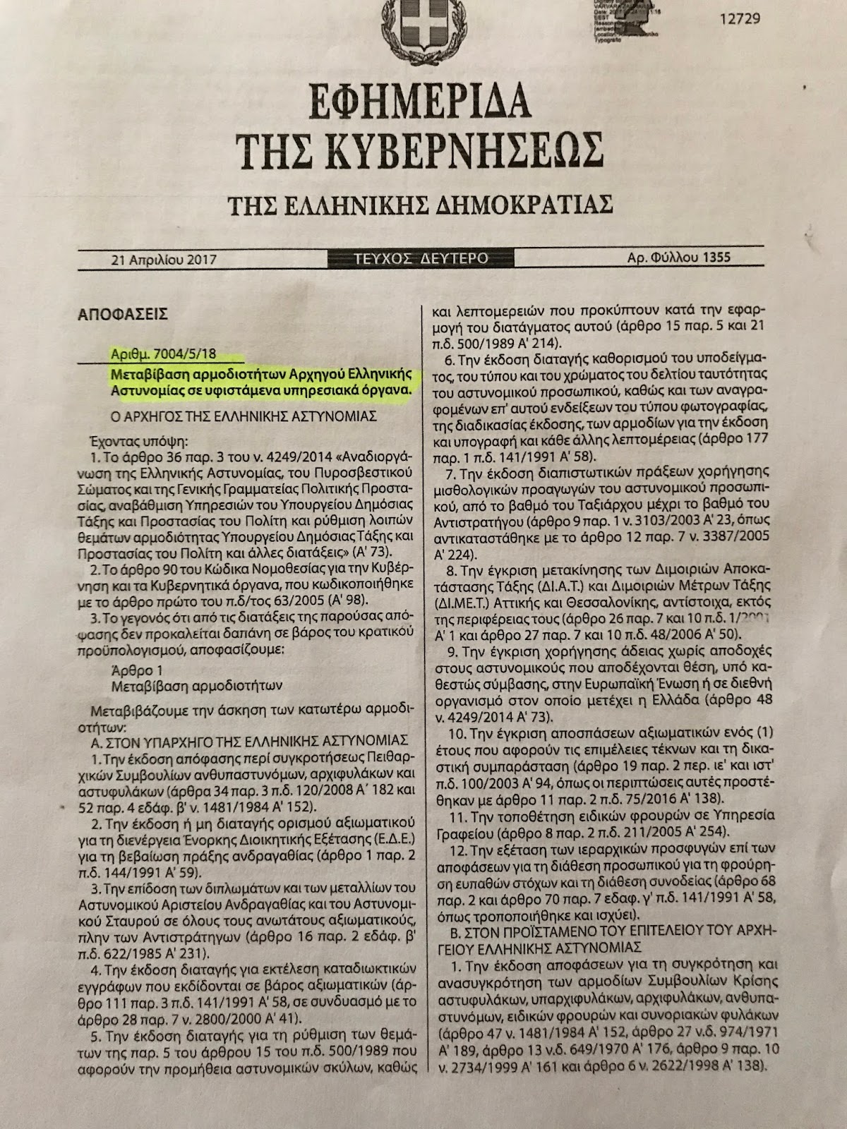 Στο πλαίσιο αυτό ο κ. Τσουβάλας με ΠΔ που φέρνει στη δημοσιότητα το bloko.gr, εκχωρεί ουσιαστικές αρμοδιότητες στους αντιστράτηγους της ΕΛΑΣ και πιο συγκεκριμένα: