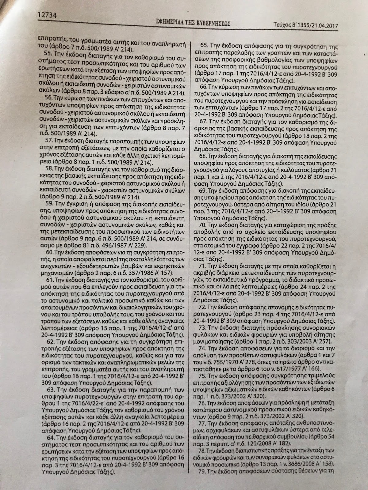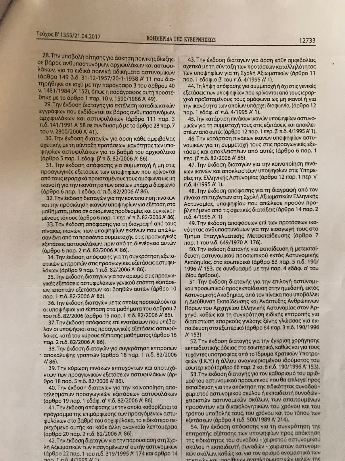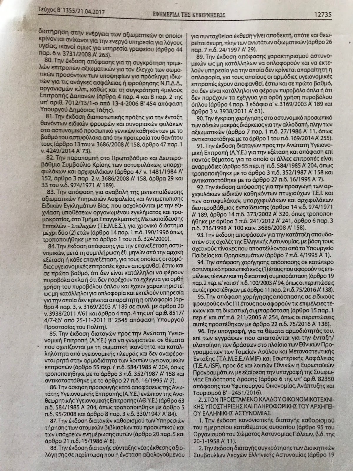 - στον υπαρχηγό 12, μεταξύ των οποίων για τα πειθαρχικά συμβούλια, τις ταυτότητες των αστυνομικών, τις μισθολογικές προαγωγές κ.α