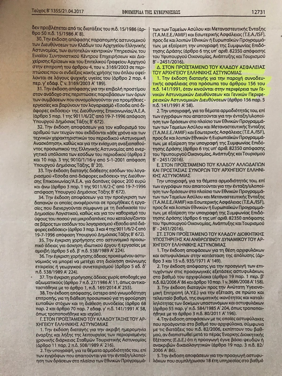 - στον επιτελάρχη 38 μεταξύ των οποίων την οπλοφορία αστυνομικών και διαθεσιμότητες