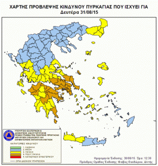 Σύμφωνα με το Χάρτη Πρόβλεψης Κινδύνου Πυρκαγιάς που εκδίδει η Γενική Γραμματεία Πολιτικής Προστασίας του Υπουργείου Εσωτερικών & Διοικητικής Ανασυγκρότησης (www.civilprotection.gr), για αύριο Δευτέρα 31 Αυγούστου 2015, προβλέπεται πολύ υψηλός κίνδυνος πυρκαγιάς (κατηγορία κινδύνου 4) για τις εξής περιοχές: