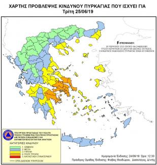 Σύμφωνα με το Χάρτη Πρόβλεψης Κινδύνου Πυρκαγιάς που εκδίδει η Γενική Γραμματεία Πολιτικής Προστασίας του Υπουργείου Προστασίας του Πολίτη (www.civilprotection.gr), για αύριο Τρίτη 25 Ιουνίου 2019, προβλέπεται πολύ υψηλός κίνδυνος πυρκαγιάς (κατηγορία κινδύνου 4) για τις εξής περιοχές: