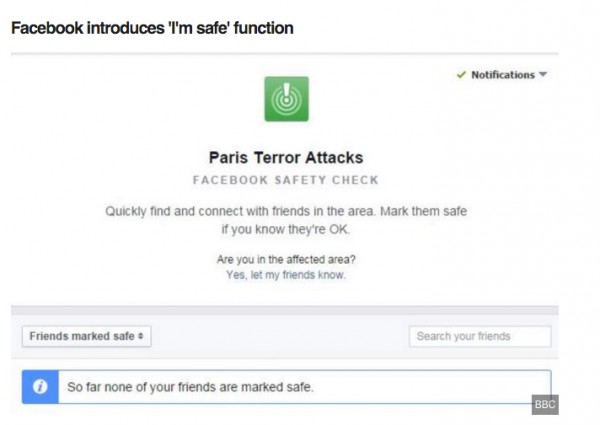 Ακόμη, το Facebook προκειμένου να βοηθήσει σε όλη αυτή την κατάσταση που είχε δημιουργηθεί ενεργοποίησε την υπηρεσία «I'm safe» («Είμαι ασφαλής»). Στόχος είναι όσοι ζουν στη γαλλική πρωτεύουσα να ενημερώσουν τα κοντινά κι αγαπημένα τους πρόσωπα ότι είναι καλά και ασφαλείς.