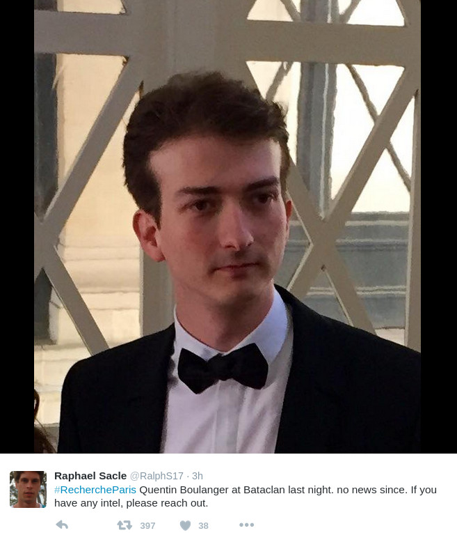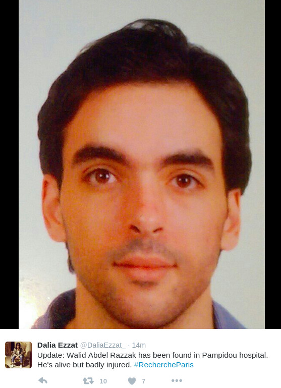 Με το ίδιο hashtag ενημερώνουν και για τις περιπτώσεις ατόμων που νωρίτερα αναζητούνταν και τελικά βρέθηκαν, όπως συνέβη στην περίπτωση του Αμπντέλ Ραζάκ, ο οποίος βρέθηκε στο νοσοκομείο Πομπιντού. «Είναι ζωντανός αλλά βαριά τραυματισμένος», γράφει το άτομο που προφανώς τον έψαχνε.