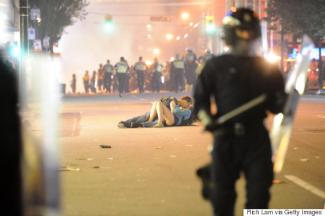 Η διάσημη φωτογραφία του Lam με το ζευγάρι που φιλιέται ανάμεσα στις ταραχές, 15 Ιουνίου 2011, Βανκούβερ, Καναδάς. (Φωτό: Rich Lam/Getty Images)
