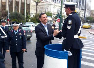 Ο Υπουργός Δημόσιας Τάξης και Προστασίας του Πολίτη, κ. Βασίλης Κικίλιας και ο Αρχηγός της Ελληνικής Αστυνομίας, Αντιστράτηγος Δημήτριος Τσακνάκης, συνοδευόμενοι από τον Γενικό Αστυνομικό Διευθυντή Αττικής, Υποστράτηγο Κωνσταντίνο Μιχαιρίνα και τον Διευθυντή της Διεύθυνσης Τροχαίας Αττικής, Ταξίαρχο Δημήτριο Παπαναγιώτου, προσέφεραν σήμερα (31.12.2014) το μεσημέρι, εθιμοτυπικά δώρα σε τροχονόμο, ρυθμιστή κυκλοφορίας στο Σύνταγμα (συμβολή των οδών Βασιλίσσης Αμαλίας και Βασιλίσσης Σοφίας).