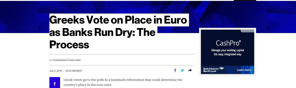 Το πρακτορείο Bloomberg σε άρθρο του που τιτλοφορείται «Οι Ελληνες ψηφίζουν για τη θέση στο ευρώ ενώ οι τράπεζες στερεύουν», ο συντάκτης επισημαίνει πως οι ψηφοφόροι καλούνται να αποφασίσουν σε ένα ιστορικό δημοψήφισμα τη θέση της χώρας στην Ευρωζώνη, υπογραμμίζοντας παράλληλα τον διχασμό του λαού.