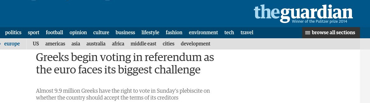 Πιο συγκεκριμένα, ο Guardian στο πρώτο του θέμα τιτλοφορείται ως «οι Ελληνες ψηφίζουν για το μέλλον τους, την ώρα που το ευρώ αντιμετωπίζει την μεγαλύτερή του πρόκληση».