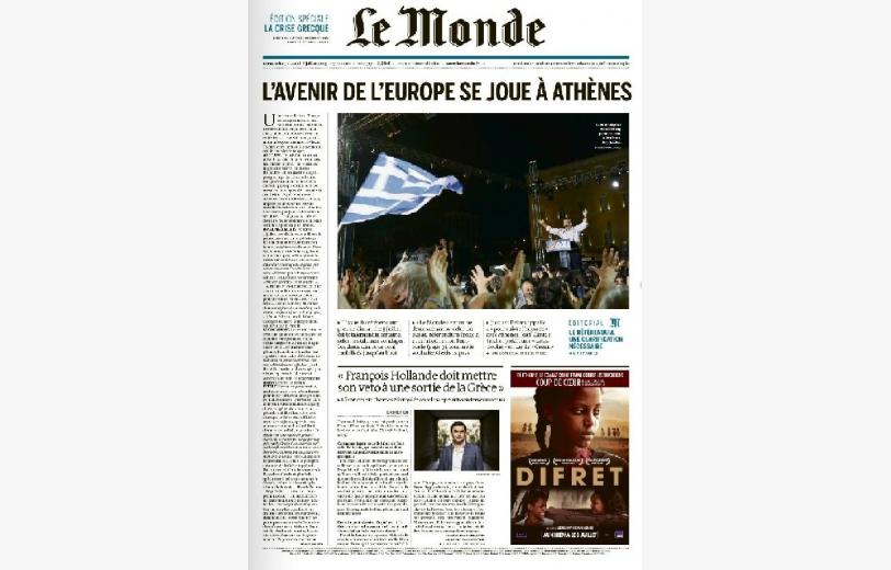 Η γαλλική εφημερίδα Le Monde αφιέρωσε το σημερινό της πρωτοσέλιδο στην Ελλάδα και το δημοψήφισμα. «Το μέλλον της Ευρώπης παίζεται στην Αθήνα» είναι ο κεντρικός τίτλος στο φύλλο, με τις σελίδες του να φιλοξενούν τα όσα διαδραματίζονται στη χώρα αλλά και τον τρόπο που αυτά επηρεάζουν το ευρωπαϊκό οικοδόμημα.