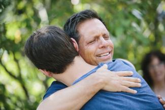 Ο άντρας ακούγεται στη συνέχεια να κλαίει καθώς η κάμερα κυλά προς τα κάτω και μαυρίζει κατά την αγκαλιά.