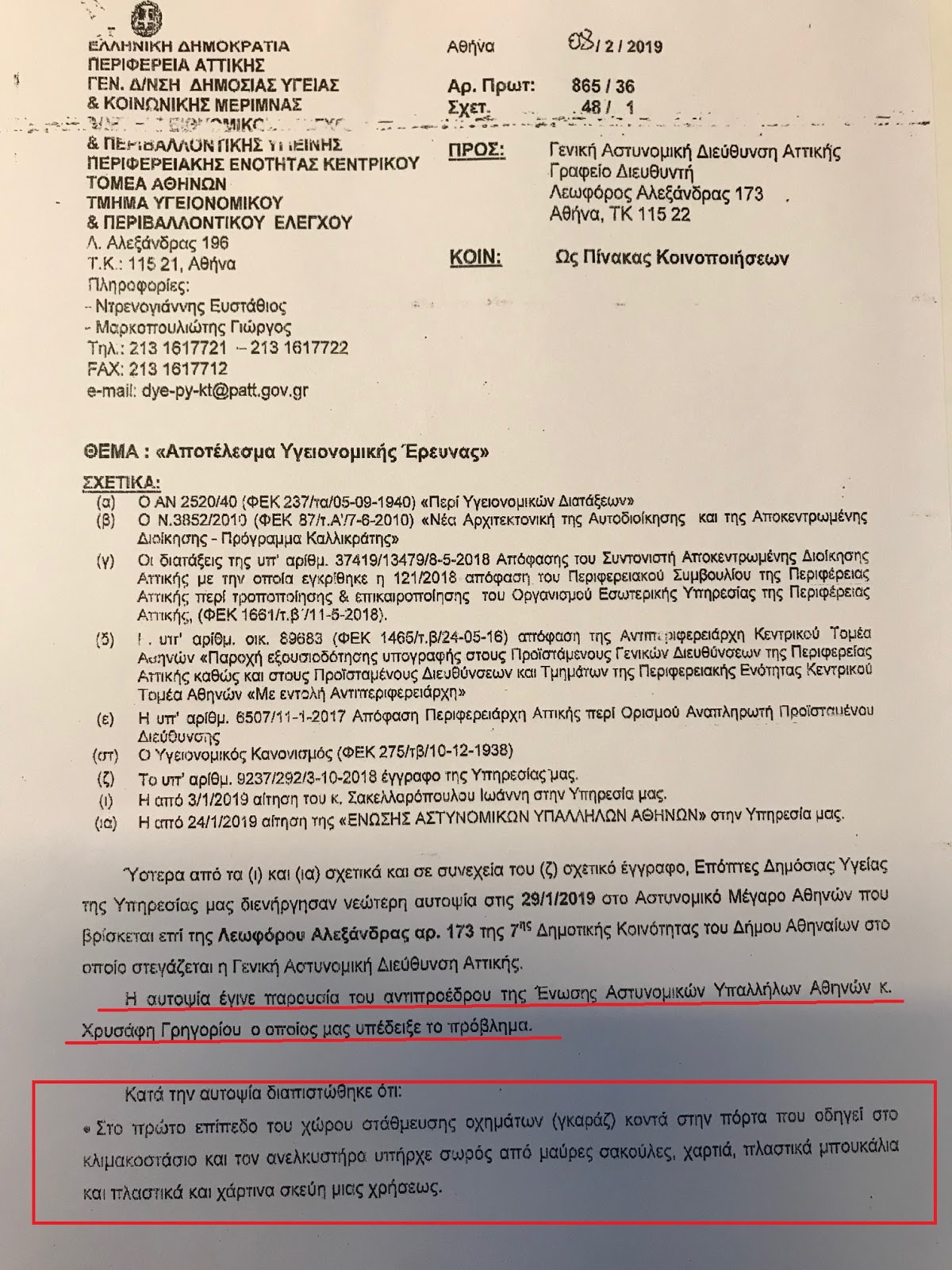 Ιδού το πόρισμα των ελεγκτών υγείας για τις συνθήκες που επικρατούν στο κτίριο της ΓΑΔΑ. Μετά από ενέργειές μας οι ελεγκτές έκαναν την αυτοψία. Δεν σταματάμε στη ΓΑΔΑ, έχουμε ζητήσει ήδη την αυτοψία σε όλες τις Υπηρεσίες των Αθηνών στις οποίες έχουμε διαπιστώσει ή μας έχει καταγγελθεί ανάλογη κατάσταση (Αστυνομικά Τμήματα, Αλλοδαπών κ.λ.π.). Με οδηγό το πόρισμα αυτό θα κινηθούμε και νομικά ώστε να προστατεύσουμε την υγεία και την αξιοπρέπειά μας.