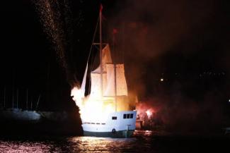 Ενα εντυπωσιακό υπερθέαμα πυροτεχνημάτων απόλαυσαν όσοι κατέκλυσαν τις προβλήτες της Πύλου για να παρακολουθήσουν την πρώτη αναπαράσταση της Ναυμαχίας του Ναβαρίνου - στο πλαίσιο της οποίας κάηκε και ένα σκάφος στο λιμάνι.