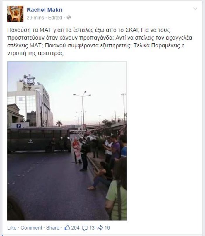 Με ανάρτησή της στο facebook η πρώην βουλετής των Ανεξαρτήτων Ελλήνων και νυν του ΣΥΡΙΖΑ αναφέρει: "Πανούση τα ΜΑΤ γιατί τα έστειλες έξω από το ΣΚΑΙ; Για να τους προστατεύουν όταν κάνουν προπαγάνδα; Αντί να στείλεις τον εισαγγελέα στέλνεις ΜΑΤ; Ποιανού συμφέροντα εξυπηρετείς; Τελικά παραμένεις η ντροπή της αριστεράς."