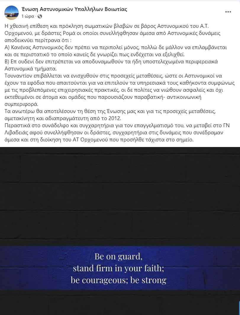 Η χθεσινή επίθεση και πρόκληση σωματικών βλαβών σε βάρος Αστυνομικού του Α.Τ. Ορχομενού, με δράστες Ρομά οι οποίοι συνελλήφθησαν άμεσα από Αστυνομικές δυνάμεις αποδεικνύει περίτρανα ότι :