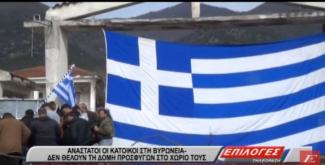 Με μία τεράστια ελληνική σημαία έκλεισαν οι κάτοικοι την είσοδο του στρατοπέδου στη Βυρώνεια του δήμου Σιντικής.