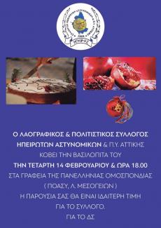 Οι Ηπειρώτες Αστυνομικοί κόβουμε την πίτα μας σήμερα Τετάρτη 14 Φεβρουαρίου 2018 ώρα 18.00 στα γραφεία της Π.ΟΑ.Σ.Υ. (οδός Μεσογείων 96 Αθήνα).