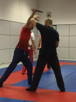 Με μεγάλο ενδιαφέρον οι συνάδελφοι παρακολούθησαν και συμμετείχαν στην εκμάθηση από τον συνάδελφο εκπαιδευτή ΛΙΟΔΑΚΗ Γιάννη, βασικών τεχνικών απόκρουσης επιτιθέμενου και αποφυγής επίθεσης με όπλο ή με μαχαίρι, καθώς και προσβολή του επιτιθέμενου καθ’ όλα τα στάδια της επίθεσης.