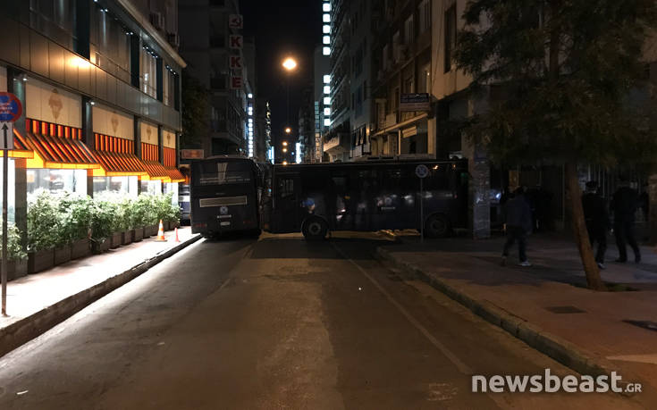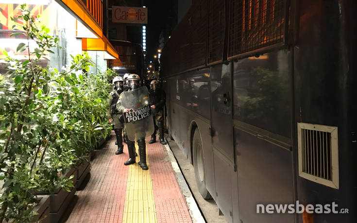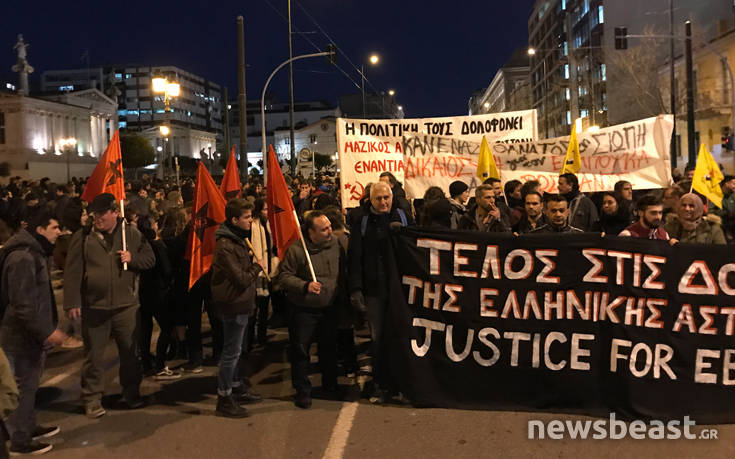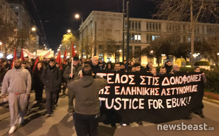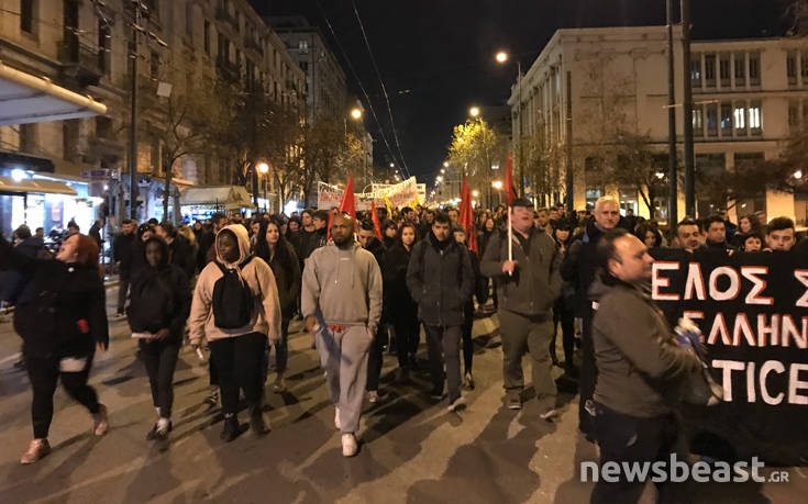 Η διαδήλωση που είχε ως σημείο συγκέντρωσης τα Προπύλαια κατευθύνεται προς το ΑΤ Ομονοίας σε ένδειξη διαμαρτυρίας για το θάνατο μετανάστη κάτω από αδιευκρίνιστες συνθήκες στο αστυνομικό τμήμα.
