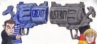 Στο σκίτσο του Ντέιβιντ Σίμονς ο Αλέξης Τσίπρας και η Άνγκελα Μέρκελ κοντραροχτυπιούνται κραδαίνοντας όπλα που ο ένας στρέφει στον άλλον ως άλλοι πιστολάδες του Φαρ Ουέστ. Το γαλανόλευκο όπλο του Αλέξη Τσίπρα φέρει το όνομα «Grexit», ενώ της Γερμανίδας το γκρίζο όπλο φέρει την ονομασία «Λιτότητα».