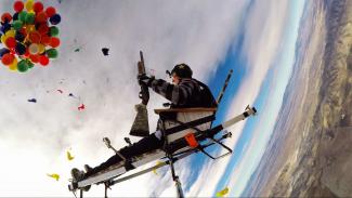Ο αθλητής της GoPro Erik Roner ίπταται στα 8.000 πόδια στον ουρανό σε μια καρέκλα γκαζόν που συνδέεται με 90 μπαλόνια καιρού. Παρακολουθήστε όπως σκάει τα μπαλόνια με το κυνηγετικό όπλο του και πέφτει με αλεξίπτωτο πίσω στη γη….!!!! Το βίντεο είναι από τη νέα κάμερα δράσης GoPro Hero 4.