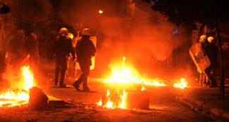 Ομάδες νεαρών – άγνωστο προσώρας αν πρόκειται για χούλιγκαν ή αναρχικούς - εκτοξεύουν πέτρες και μολότοφ κατά αστυνομικών. Οι ισχυρές δυνάμεις των ΜΑΤ απαντούν με κρότου λάμψης. Η ατμόσφαιρα είναι αποπνικτική.