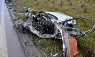 Στη συνέχεια το πρώτο όχημα βγήκε εκτός δρόμου και έπεσε με σφοδρότητα σε δέντρο, με αποτέλεσμα το αυτοκίνητο να διαλυθεί και ότι απέμεινε να μεταφερθεί σε άμορφη μάζα σιδερικών.
