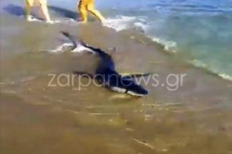 Όπως φαίνεται στο αποκλειστικό βίντεο που δημοσιεύει το zarpanews.gr και απαθανάτισε λουόμενος από το σημείο, το θαλάσσιο κήτος που εμφανίζει χαρακτηριστικά καρχαριοειδούς, βγήκε στη στεριά και εκγλωβίστηκε στην ακτή.