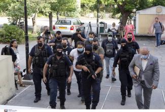 Όπως βλέπετε στις εικόνες, οδηγήθηκε στα δικαστήρια χωρίς τα ράσα του, με χειροπέδες και τα χέρια του πίσω από από την πλάτη του και με τη συνοδεία πάνοπλων αστυνομικών.