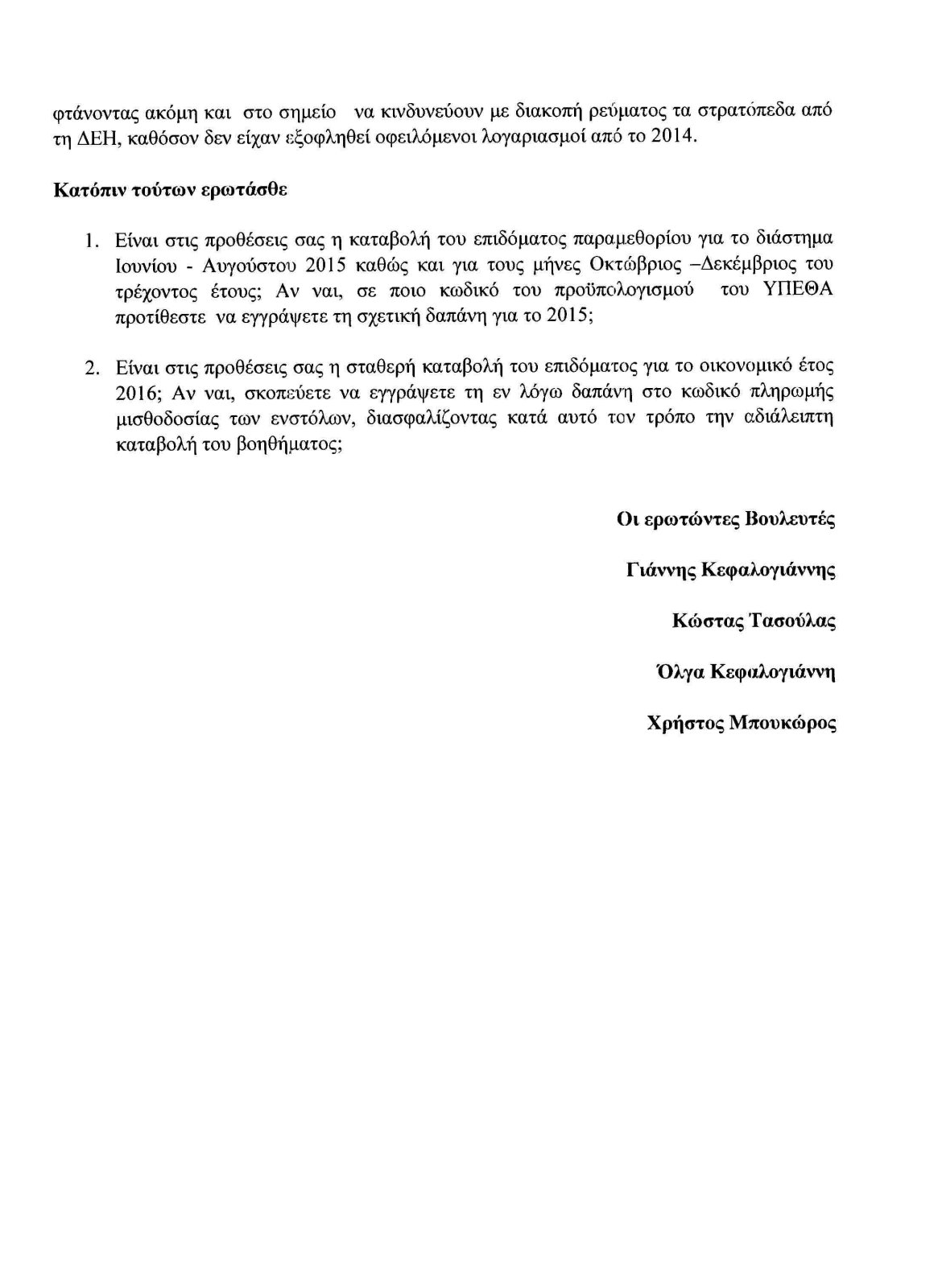 Ειδικότερα, στην ερώτηση που κατέθεσε στη Βουλή προς τον Πάνο Καμμένο ο Γ. Κεφαλογιάννης και συνυπέγραψαν οι βουλευτές της Ν.Δ. Κώστας Τοσούλας, Όλγα Κεφαλογιάννη και Χρήστος Μπουκώρος, αφού αναφέρουν ότι «παραμένει αβέβαιη η καταβολή του επιδόματος τους εναπομείναντες μήνες του τρέχοντος έτους», παρατηρούν ότι «ο τρόπος που επέλεξε η ηγεσία του ΥΠΕΘΑ να το καταβάλει, δημιούργησε σοβαρά προβλήματα στη λειτουργία των Ε.Δ., αφού ανάγκασε τα Επιτελεία να περιορίσουν κρίσιμες δαπάνες (συντήρηση εγκαταστάσεων, μεταφορικών μέσων, υλικά υγειονομικής περίθαλψης κ.λπ.), φτάνοντας ακόμη και στο σημείο να κινδυνεύουν με διακοπή ρεύματος τα στρατόπεδα από τη ΔΕΗ, καθόσον δεν είχαν εξοφληθεί οφειλόμενοι λογαριασμοί από το 2014».