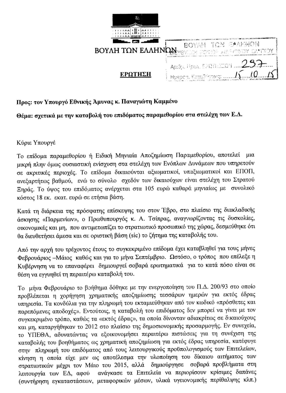 Κάντε κλικ στις παρακάτω φωτό για να διαβάσετε την σχετική ερώτηση στα πλαίσια του ΚΟΙΝΟΒΟΥΛΕΥΤΙΚΟΥ ΕΛΕΓΧΟΥ με θέμα «Σχετικά με την καταβολή του επιδόματος παραμεθορίου στα στελέχη των Ενοπλων Δυνάμεων»:
